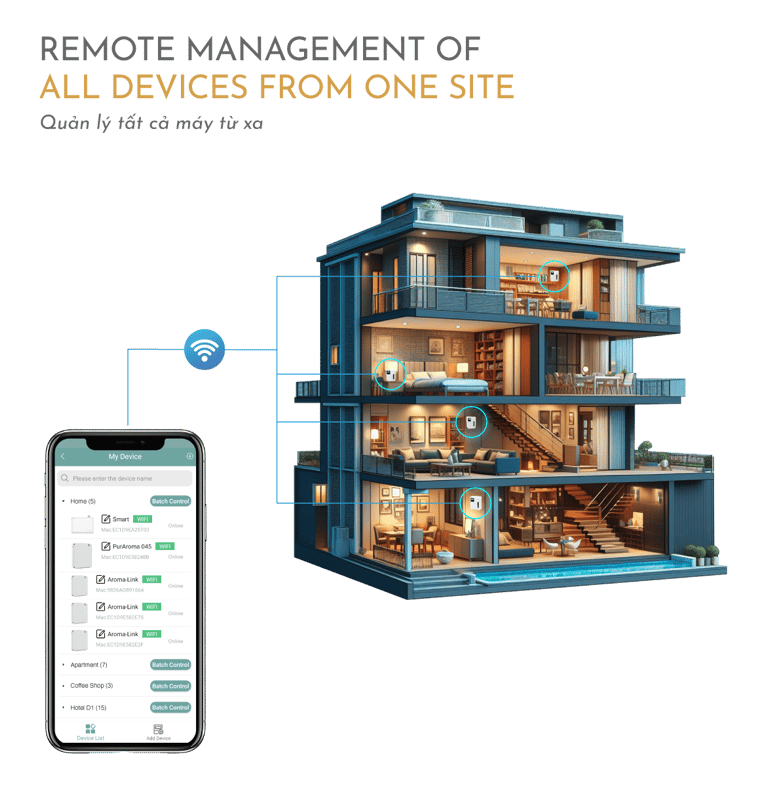 Kết nối thông minh: Máy khuếch tán tinh dầu PurAroma có tính năng điều khiển qua Bluetooth và Wi-Fi, cho phép quản lý nhiều thiết bị dễ dàng để có trải nghiệm liền mạch cho người dùng, có thể quản lý máy từ bất cứ nơi nào.